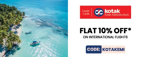 This discount is applicable on International Flight Booking (On Min. Booking of ₹15000. On Payment via Kotak Bank Credit Card EMI only. Max. Once per user. Maximum discount applicable is ₹5000. Also Get 3 and 6 Month No Cost EMI)